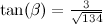 At the end of the cone's journey, the point P1, shown in figure 7, will be at the left-hand apex of the double cone, and its distance to G will be the length of one cone, which is 9. This gives $$\sin(\beta) = \frac{length \; of \; one \; cone}{length \; of \; shadow \;of \; rail} = \frac{9}{36 \cos(\alpha)} = \frac{3}{\sqrt{143}}.$$ Again we have a right angled triangle whose third side is $ \sqrt{143 - 9} = \sqrt{134}$, making $\cos(\beta) = \frac{\sqrt{134}}{\sqrt{143}}$, so $\tan(\beta) = \frac{3}{\sqrt{134}}$.