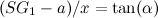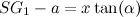 Now the height y of G is SG1 + SG. For the second part we have SG = r-RS, where 2r is the thickness of the double cone at its centre (see figure 4). So $$SG = r - RS = r - x\tan(\beta)\tan(\gamma).$$ This gives $$ y = SG_1 + SG = SG_1 + (r - x \tan(\beta)\tan(\gamma)).$$ Figure 5 below shows the same view as figure 1. Noting that the point G1 is at distance x from the origin of the coordinate system, we get $(SG_1 - a)/x = \tan(\alpha)$ and hence $SG_1 - a = x \tan(\alpha)$.