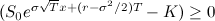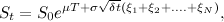 Before taking our limit, it is important that we choose our parameters so that they scale in the correct way. First of all, we fix a terminal time, $T$, which is the expiry time of the option. Then set our $\delta t$ to be given by $\delta t = T/N$. We will assume that: \begin{eqnarray*} u &=& e^{ \sigma \sqrt{\delta t} + \mu \delta t} \\ d &=& e^{ -\sigma \sqrt{\delta t} + \mu \delta t}.\end{eqnarray*} Furthermore, we assume that the probability of a good or bad period is the same,that is the probability of either period is 1/2 (although as before, this probability won't matter for the option pricing). The stock price at time $T$ is: \begin{eqnarray} S_{t} = S_{0} e^{ \mu T + \sigma \sqrt{ \delta t} ( \xi_{1} + \xi_{2} + .... + \xi_{N})}, \end{eqnarray} where $\xi_{i}$ is a random variable which is 1 if the $i$th period was good and -1 otherwise. Now, we need to work out the equivalent probability, $q$, of an up jump, just as we did before. We have that: $$ q = \frac{e^{r \delta t} - u}{u-d} .$$ If we use a Taylor expansion on the exponential terms, we see that this gives: $$ q = \frac{1}{2} ( 1- \sqrt{\delta t} \frac{ \mu - r + \sigma^{2}/2}{\sigma}) + O( \delta t).$$ We want to look at the limit as $N$ tends to infinity. From our earlier analysis, we should base the price of the option on the behaviour of equation 1, but assuming that the probability of $\xi$ being +1 is given by $q$, rather than 1/2. The Central Limit Theorem tells us that if we have a sum of independent and identically distributed variables, which we sum and scale in the correct way, then in the limit we obtain a Normal distribution. To apply the CLT, we must first calculate the expectation of the random terms in the exponential in equation 1. Remember that we must use the probabilities $q$ to calculate this expectation: $$ \mathbb{E^{Q}}[ \sigma \sqrt{\delta t} ( \xi_{1} + \xi_{2} + .... + \xi_{N})] & = \sigma \sqrt{\delta t} (2 q - 1) \\ & = -(\mu - r + \sigma^{2}/2)T,$$ where we have ignored the $O(\delta t)$ terms. We have can then apply the Central Limit Theorem: $$ \sigma \sqrt{ \delta t} ( \xi_{1} + \xi_{2} + .... + \xi_{N}) = \sigma \sqrt{T} \frac{( \xi_{1} + \xi_{2} + .... + \xi_{N})}{\sqrt{N}} \\ \rightarrow_{N \rightarrow \infty} -(\mu - r + \sigma^{2}/2)T + \sigma \sqrt{T} N(0,1),$$ where the convergence is in distribution and $N(0,1)$ denotes a Normal distribution with mean 0 and variance 1. So we see that in the limit, we should price based on the assumption that: $$ S_{t} = S_{0} e^{ \mu T -(\mu - r + \sigma^{2}/2)T + \sigma \sqrt{T} N(0,1) } = S_{0} e^{ \sigma \sqrt{T} N(0,1) + (r-\sigma^{2}/2)T }.$$ Note that the true drift of the stock, $\mu$, does not matter for pricing these options, since the value of $\mu$ cancels in the expressions above. \\ We know now that we should base pricing on the formula given above. Therefore, we can now go about pricing the call option mentioned above. The price of this call option is: \begin{eqnarray*} \mathbb{E} [ (S_{T} - K)_{+} ] & = & \mathbb{E} [ (S_{0} e^{ \sigma \sqrt{T} N(0,1) + (r-\sigma^{2}/2)T } - K)_{+}] \\ & =& \int_{-\infty}^{\infty} \frac{e^{-x^{2}/2}}{\sqrt{2 \pi}} (S_{0} e^{ \sigma \sqrt{T} x + (r-\sigma^{2}/2)T } - K)_{+} dx \\ & = & \int_{a}^{\infty} \frac{e^{-x^{2}/2}}{\sqrt{2 \pi}} (S_{0} e^{ \sigma \sqrt{T} x + (r-\sigma^{2}/2)T } - K) dx \end{eqnarray*} where $a$ is the least value of $x$ such that $(S_{0} e^{ \sigma \sqrt{T} x + (r-\sigma^{2}/2)T } - K) \ge 0$, that is: $$ a = \frac{\log(K e^{-rT} /S_{0}) + \sigma^{2}/2}{\sigma \sqrt{T}}.$$ We may easily compute this integral (complete the square in the exponential) to obtain the price as: $$ S_{0} \bar{\Phi}(a - \sigma \sqrt{T}) - e^{-r T} K \bar{\Phi}(a),$$ where $\Phi$ is the cumulative distribution function of a standard Normal random variable and $\bar{\Phi}(a)= 1-\Phi(a)$. Rearrangement gives the price as: $$ \boxed{S_{0} \Phi(d_{1}) - e^{-r T} K \Phi(d_{1}- \sigma \sqrt{T})},$$ where $d_{1} = \frac{\log(e^{r T} S_{0}/K) + \sigma^{2} T/2}{\sigma \sqrt{T}}$. This is the famous Black-Scholes formula.$$