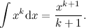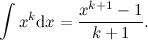 First consider the (easy) case $k\neq -1$. If we fix $k$ and differentiate $\frac{x^{k+1}-1}{k+1}$ then we obtain \[ \frac{\mathrm{d}}{\mathrm{d}x}\frac{x^{k+1}-1}{k+1} = x^k.\] So $$\frac{x^{k+1}-1}{k+1}=\frac{x^{k+1}}{k+1}-\frac{1}{k+1}$$ is an anti-derivative of $x^k$. When $k$ is fixed, the term $-\frac{1}{k+1}$ is a number, and so disappears when we differentiate with respect to $x$. In fact, when we integrate we should really add a constant of integration, so it is arguably better to write (1) as \[ \int x^k\mathrm{d}x = \frac{x^{k+1}}{k+1}+c. \] In formula (3) we have simply chosen a slightly different constant of integration than in (1), but that shouldn't cause any difficulties. What then is the point of (3)? Turning now to the case $k=-1$, whereas in (1) we had $$\frac{x^{0}}{0}=\frac{1}{0},$$ in (3) we obtain $$\frac{x^{0}-1}{0}=\frac{0}{0}.$$ Is this any more meaningful, and if so in what way? These are the questions we hope to answer.