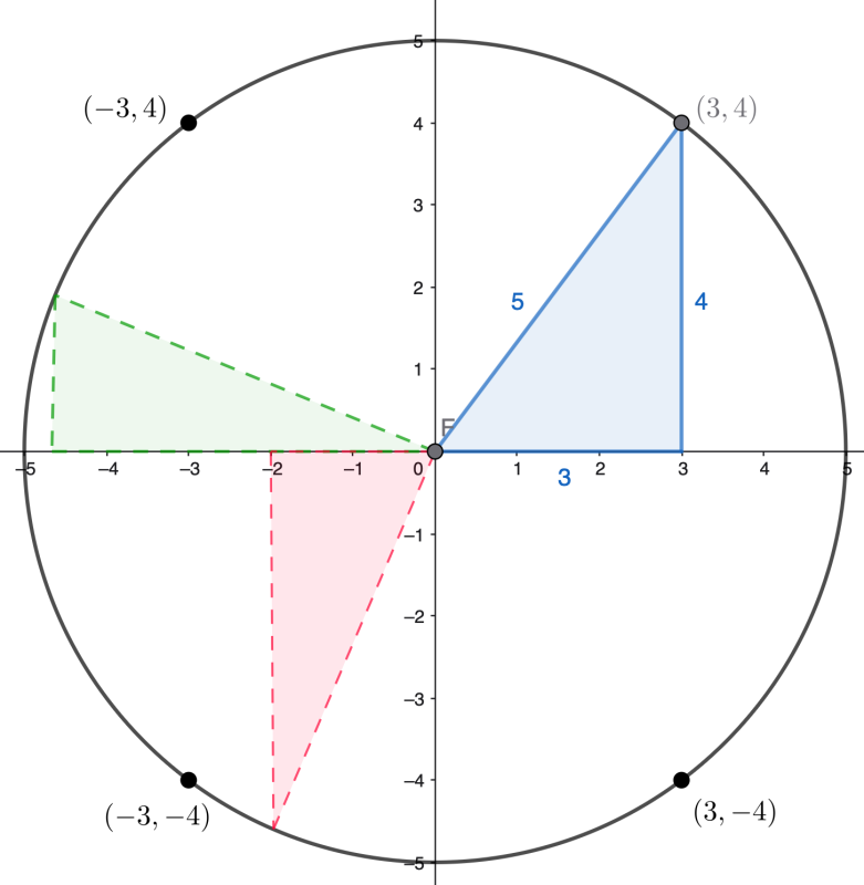 And there is more. You can imagine placing this triangle in a Cartesian coordinate system as shown below. Now draw a circle with centre at the point $(0,0)$ and with radius $5$: