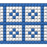 In general, if you choose a positive integer $k$ and colour in blue all multiples of $k$ in the multiplication table, you get a corresponding blue grid. The complement of the blue grid is always made up of squares consisting of $(k-1)^2$ little squares. Depending on whether or not $k$ is a prime number, these larger squares are solidly white or contain some blue squares. Because this is so much fun, let's do another one. Here's the pattern we get from $k=6$ (you can quite easily imagine the pattern for $k=5$ because 5 is prime).