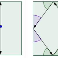 What will the trajectory of a ball typically look like? "If you shoot the ball so that it hits one of sides of the table head-on (its trajectory forming a right angle with the side), then it will return along the same trajectory it arrived on, but travelling in the opposite direction. It will carry on to hit the opposite edge at the exact opposite point, retrace its path, and keep bouncing between the two opposite points along the same straight line forever. Similarly, by getting your initial direction just right, you can make sure that the ball bounces off the mid point of all four edges in turn and then returns to where it started, travelling along the same four line segments forever.