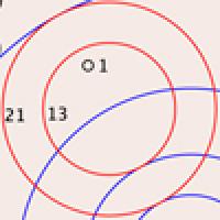 Since, as we know from the definition of the sequence, 34 - 13 = 21, the smaller red circle is tangent to the second smallest blue circle, which has radius 21. For the same reason, because 34 - 21 = 13, the larger red circle is tangent to the smallest blue circle, which has radius 13. Adding the radius of the smallest blue circle and the diameter of the larger red circle we get 13 + 2 x 21 = 13 + 21 + 21 = 34 + 21 = 55. Which is why the larger red circle is also tangent to the largest blue circle, which has radius 55. Thus, the outer boundaries of the girdle rings fit neatly between the smallest and the largest of the blue concentric circles.