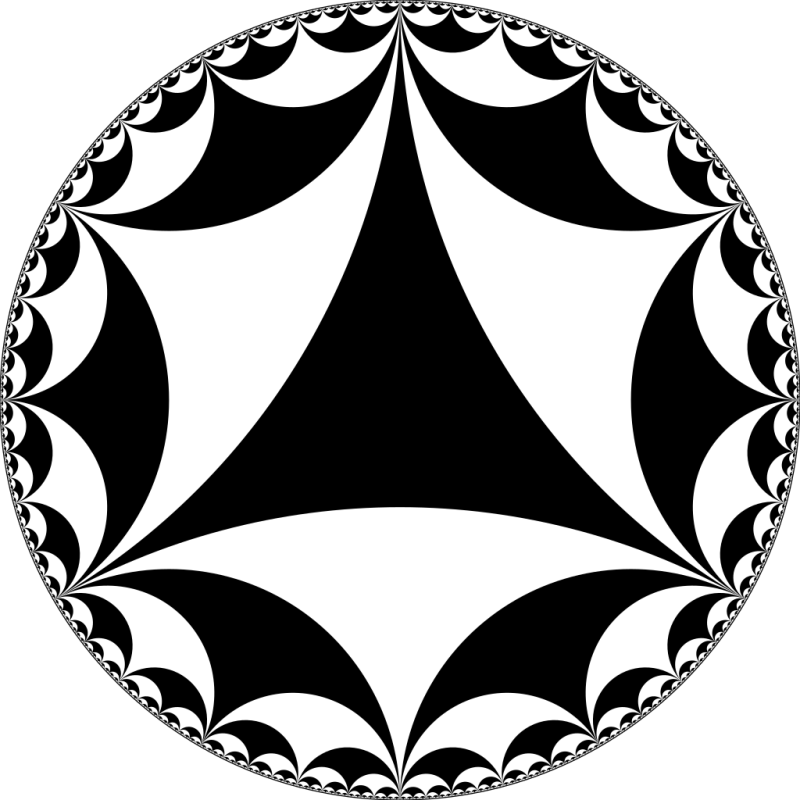 If you flatten a crinkly hyperbolic surface that is tiled with identical triangles you get something like the image above, where it is flattened into a disc. The straight lines (or geodesics) of the hyperbolic surface become curves on the flat disc.