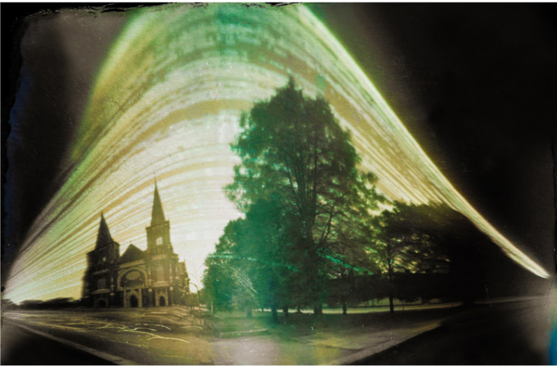 Piotr Cieślak piece made use of solarigraphy. This is a technique that uses photographic paper without chemical processing, a scanner and simple pinhole camera. By such simple means, he was able to capture the randomness of the interaction between something deterministic, such as the motion of the Sun, with unpredictable factors, such as the weather and the imperfections of a handmade camera. These add noise to the photographs which aren't considered as imperfections (as they might normally be) so much as integral to the piece of art itself.