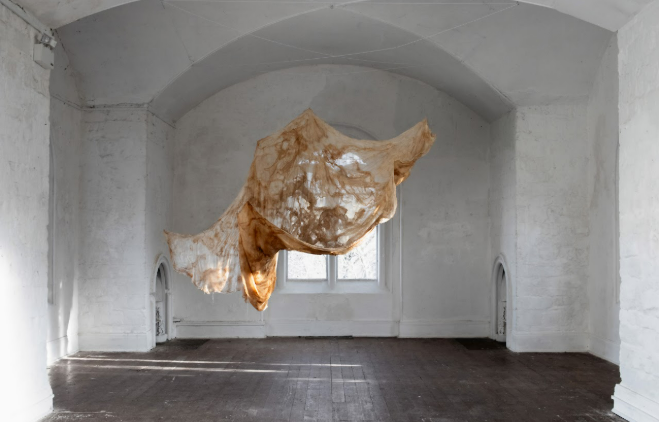 A description of the Aral Sea in Central Asia is usually written in the past tense. In the mid 1960s, it was one of the largest inland lakes in the world. Alas, now, due to Soviet irrigation projects, it has largely dried up into desert, leaving behind a skeleton scarred by sediment and salt, rippled by boundary layers and fluid mechanics, all of course governed by mathematics. The work was created with silk and cotton, intentionally chosen as both materials were grown with water that could have fed the Aral Sea. The piece is hung unevenly from the ceiling were light from nearby windows pierces it, making its randomness beautiful, its chaos candescent.