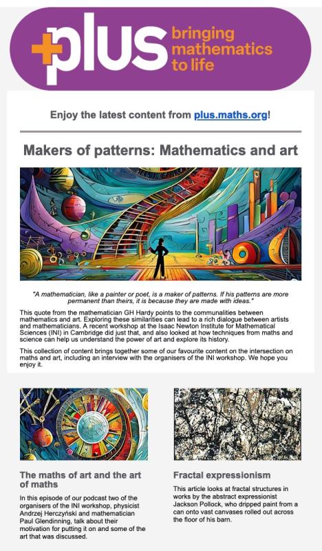 If you'd like to receive email updates from Plus, including the latest news, reviews and information on maths events, you can now register below to our mailing list. This service is free, and you should receive an e-mail every 2 to 3 weeks.