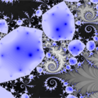 Their proof relies on an extension of the model that produces another very pretty picture. Each model is represented by a point moving around a circle, which itself sits in the two-dimensional plane. It is possible to extend each model to the whole plane, so rather than points moving on a circle you're looking at points moving around in the plane (this extension uses complex numbers). The image below shows the behaviour of points in the plane for a particular Arnol'd model (a particular choice for the parameters a and b). The grey areas are the Julia set of the corresponding function, points here are moved around by the model in a chaotic fashion (you can find more about Julia sets here). Points that are not part of the Julia set are moved around in a more regular manner.