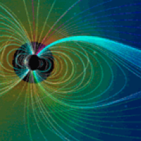 Computer simulation of the Earth's field. The lines represent magnetic field lines, blue when the field points towards the center and yellow when away. The dense clusters of lines are within Earth's core. Image courtesy NASA.
